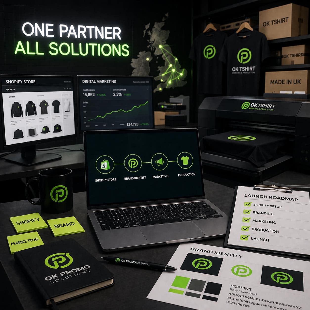 OK Promo Solutions helps serious founders build a real clothing brand with done-for-you Shopify development, branding, SEO, launch planning and UK-based production support.