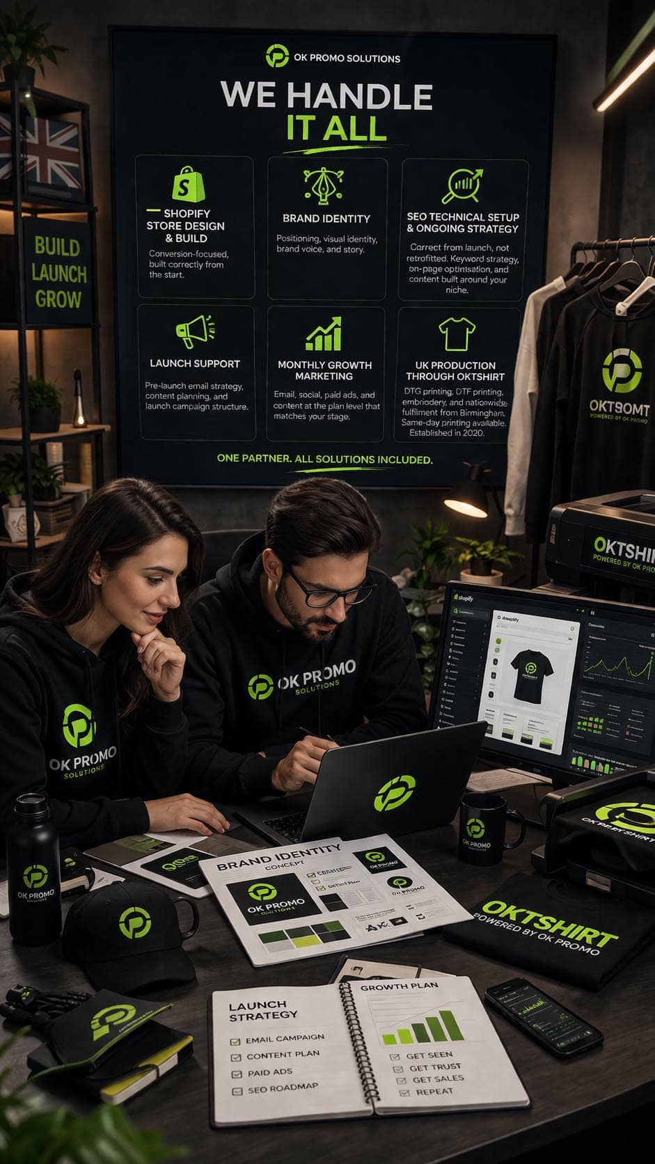 We help with Shopify store design and build, brand identity, positioning, SEO technical setup, on-page optimisation, launch systems, email capture, launch planning, growth marketing, and access to UK-based production support through OKTshirt.